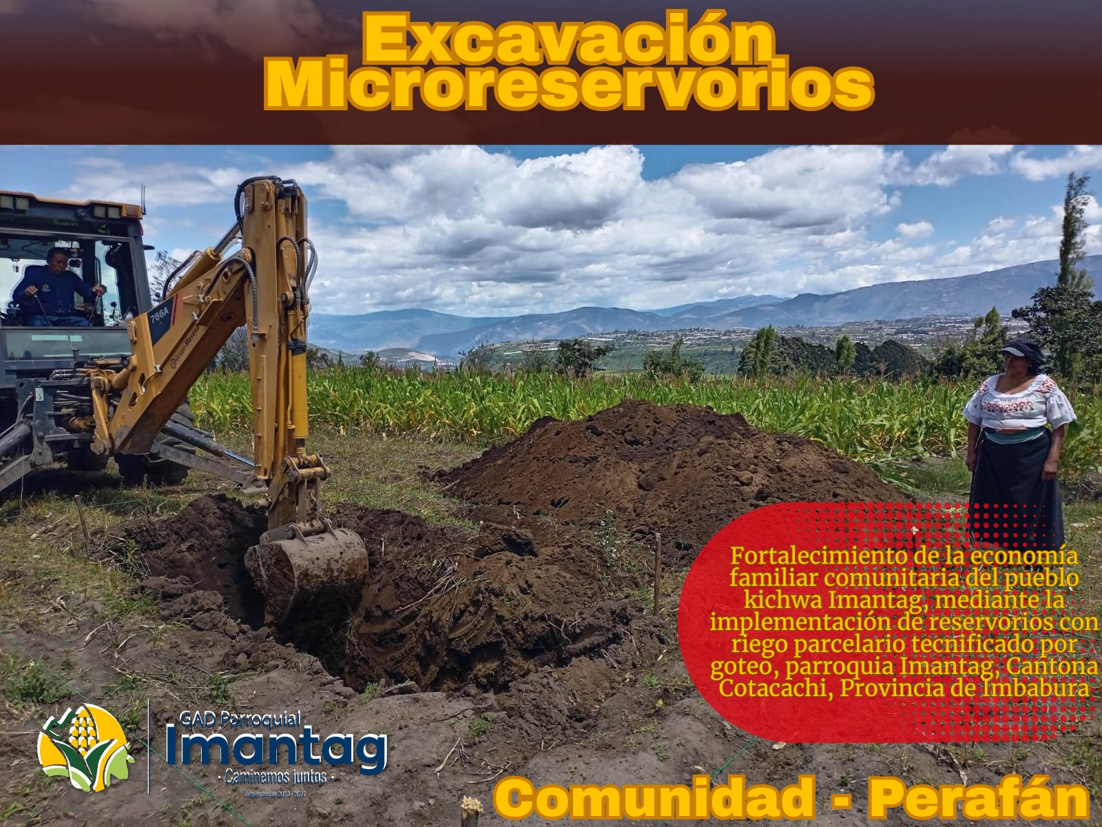 Se realizará la excavación de 53 reservorios en las comunidades de Perafán, Colimbuela, Ambi Grande, Morlán, Carbonería, Quitumba Grande, Pucalpa y el casco parroquial, fortaleciendo la producción agrícola y mejorando la calidad de vida de nuestros habitantes.